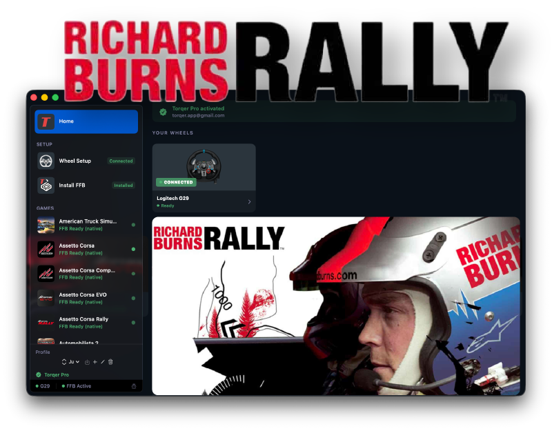 In Torqer’s sidebar, click Richard Burns Rally. FFB starts automatically when the game launches, nothing else to configure.
